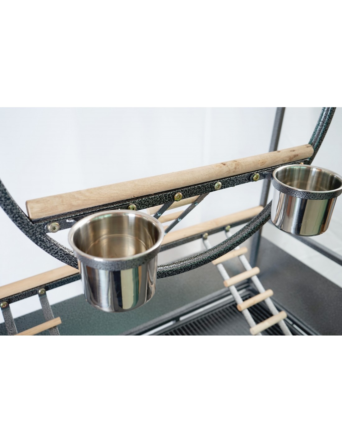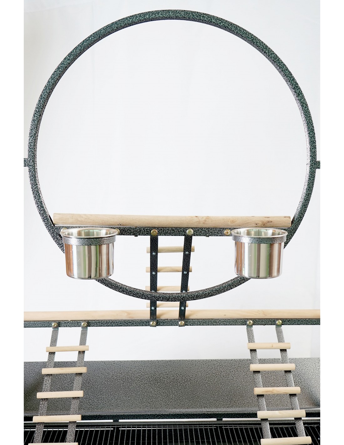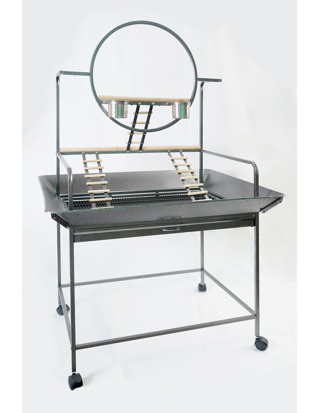 Trespolo per pappagalli in metallo nero martellato con ruote diam. 60 cm.